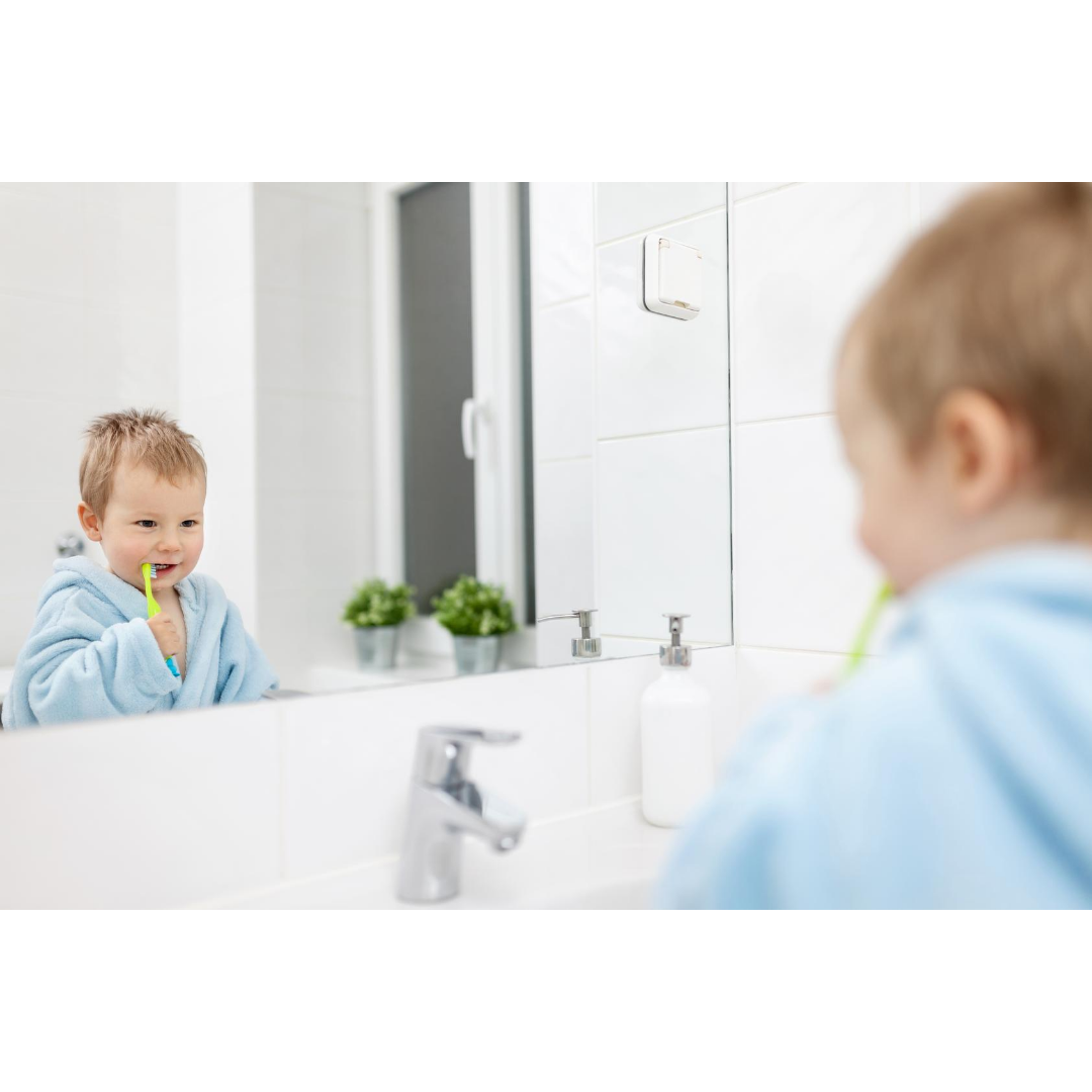 Avoid letting your child walk around or just sit chewing on a toothbrush -if they were to fall or push the brush too far back in their mouth, they could cause a serious injury to themselves. It is also important for them not to see the toothbrush as toy, but as something that is used twice a day for 2 mins and for teeth brushing only.