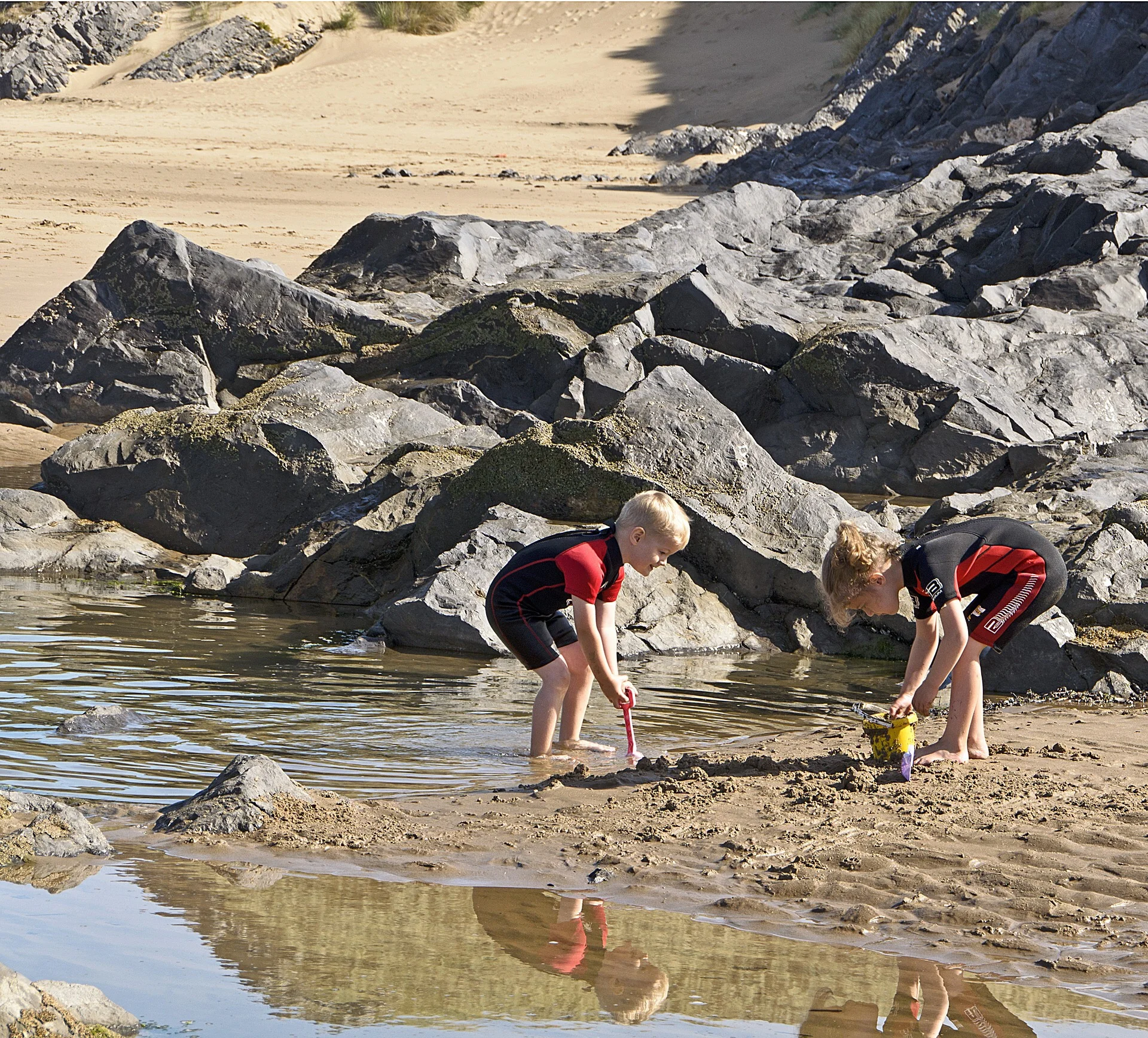 Children playing in the sea by some rocks